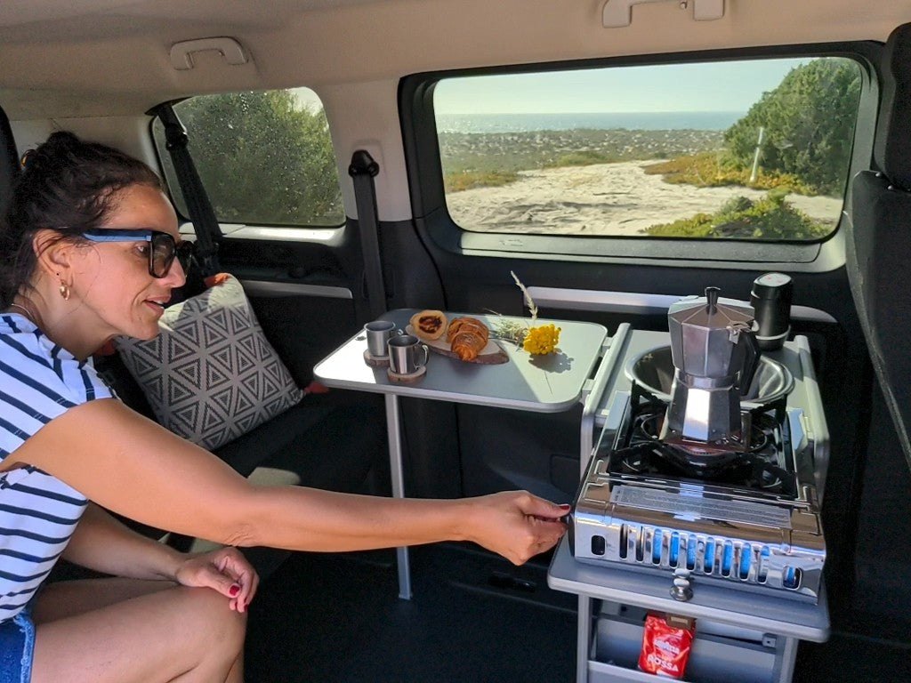 Team Vangear has a range of compact kitchen pods from the slimline Nano-Pod to the Mini-Pod and CRX-Pod. In essence they are an entire campervan kitchen in a miniature package. Features include, a sink with a cordless tap, self-contained plumbing, a stove, a table/door and storage. They come fully assembled and ready to go.