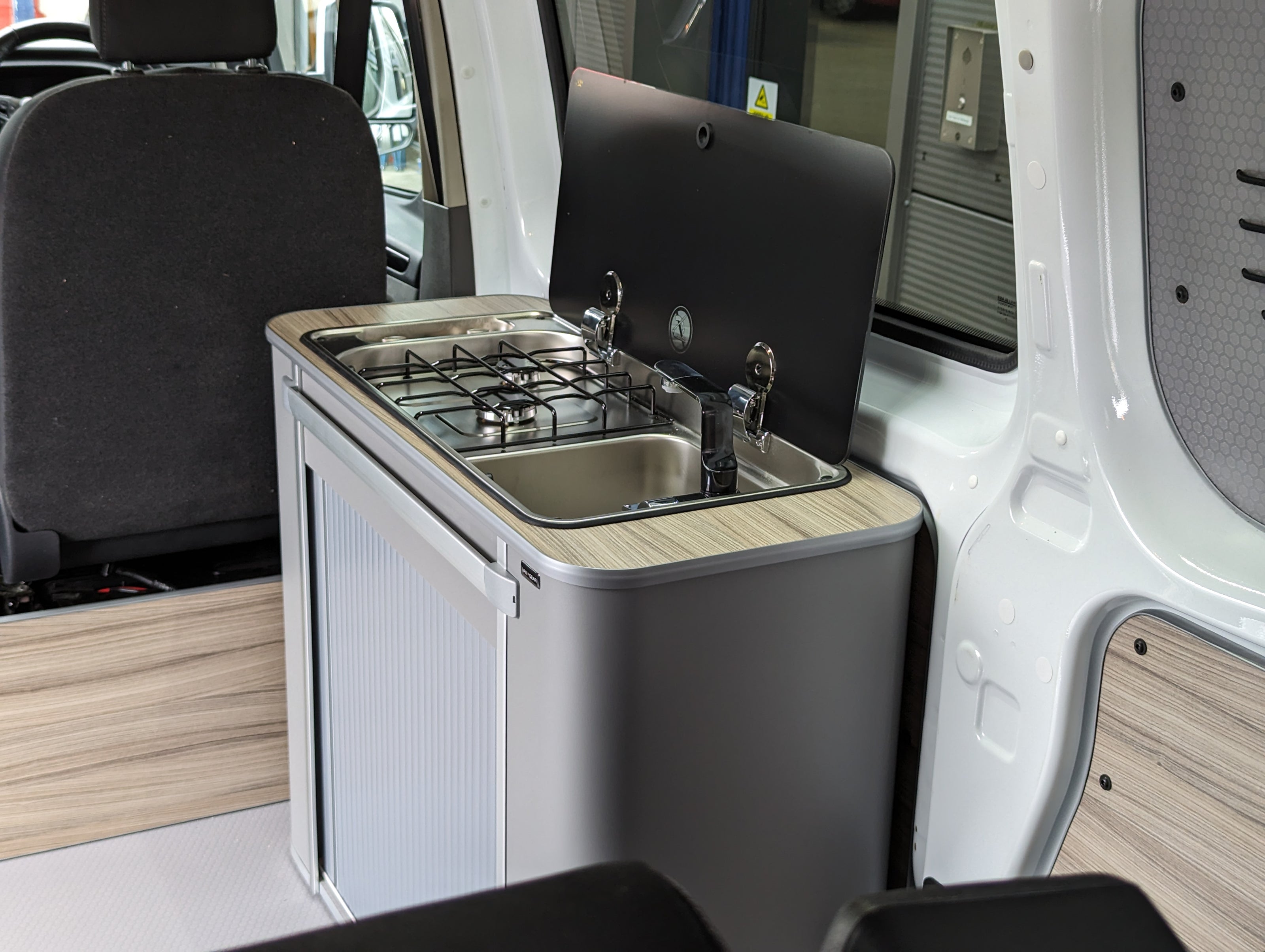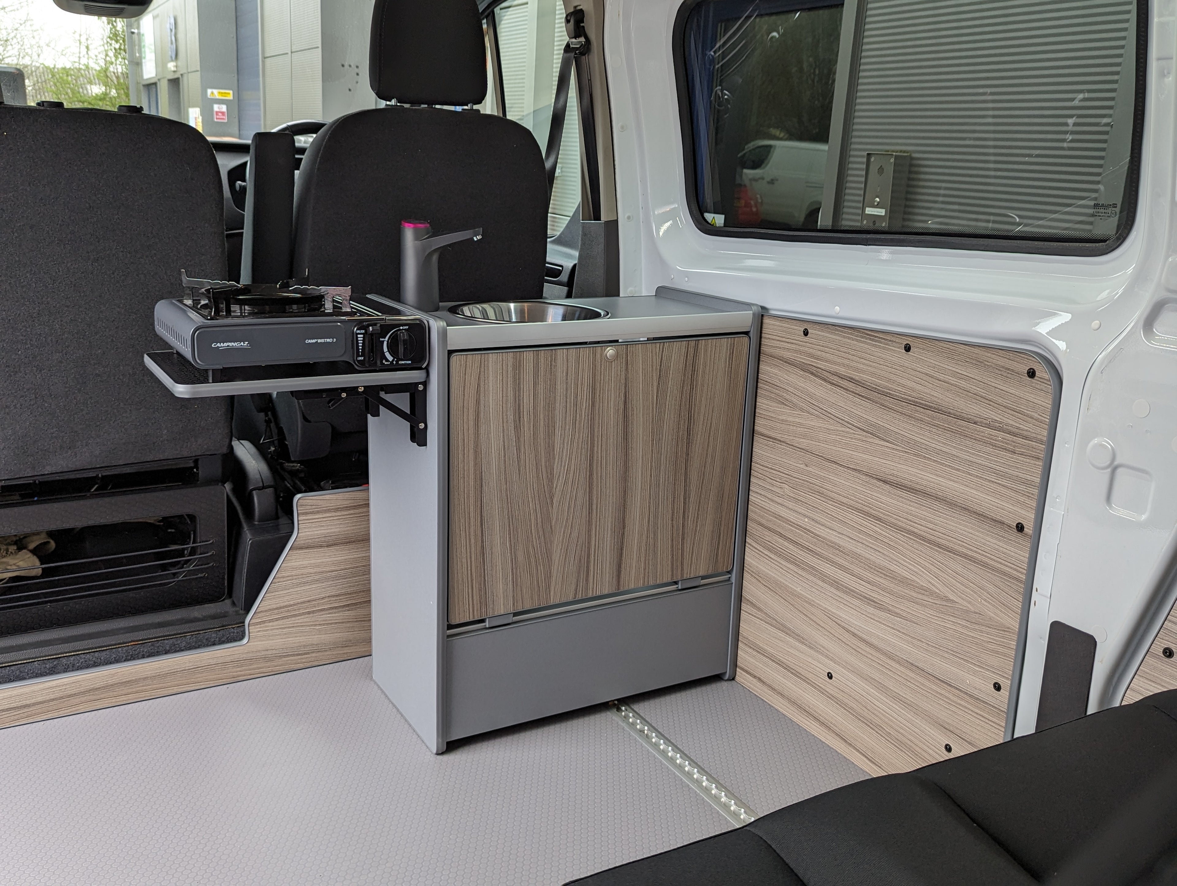 Introducing Vangear modular self fit furniture - the perfect solution for campervans. With its versatile design, it provides all the necessary features for a functional camper kitchen on the go. Experience the convenience and efficiency of the Vangear campervan system on your next trip.