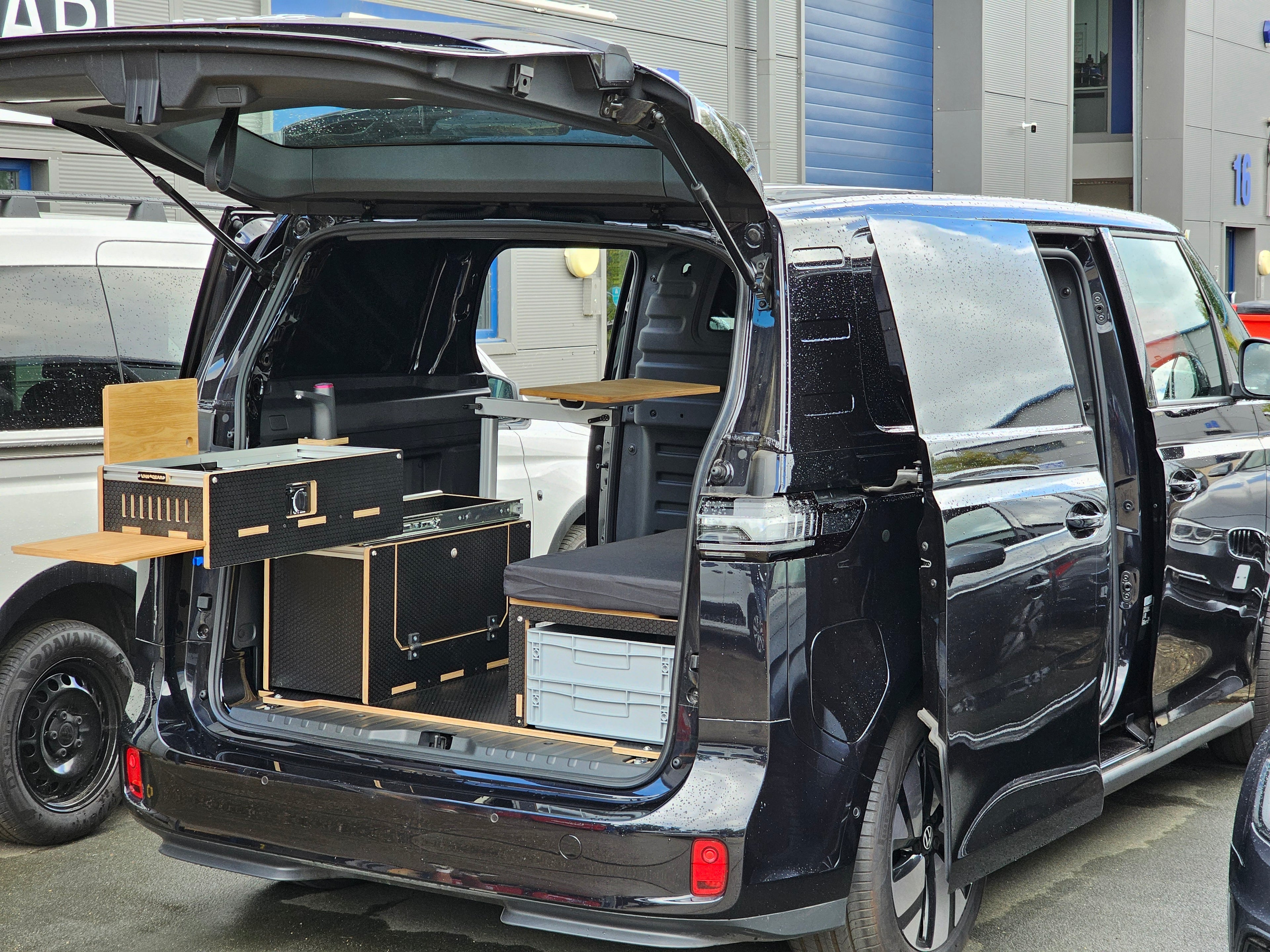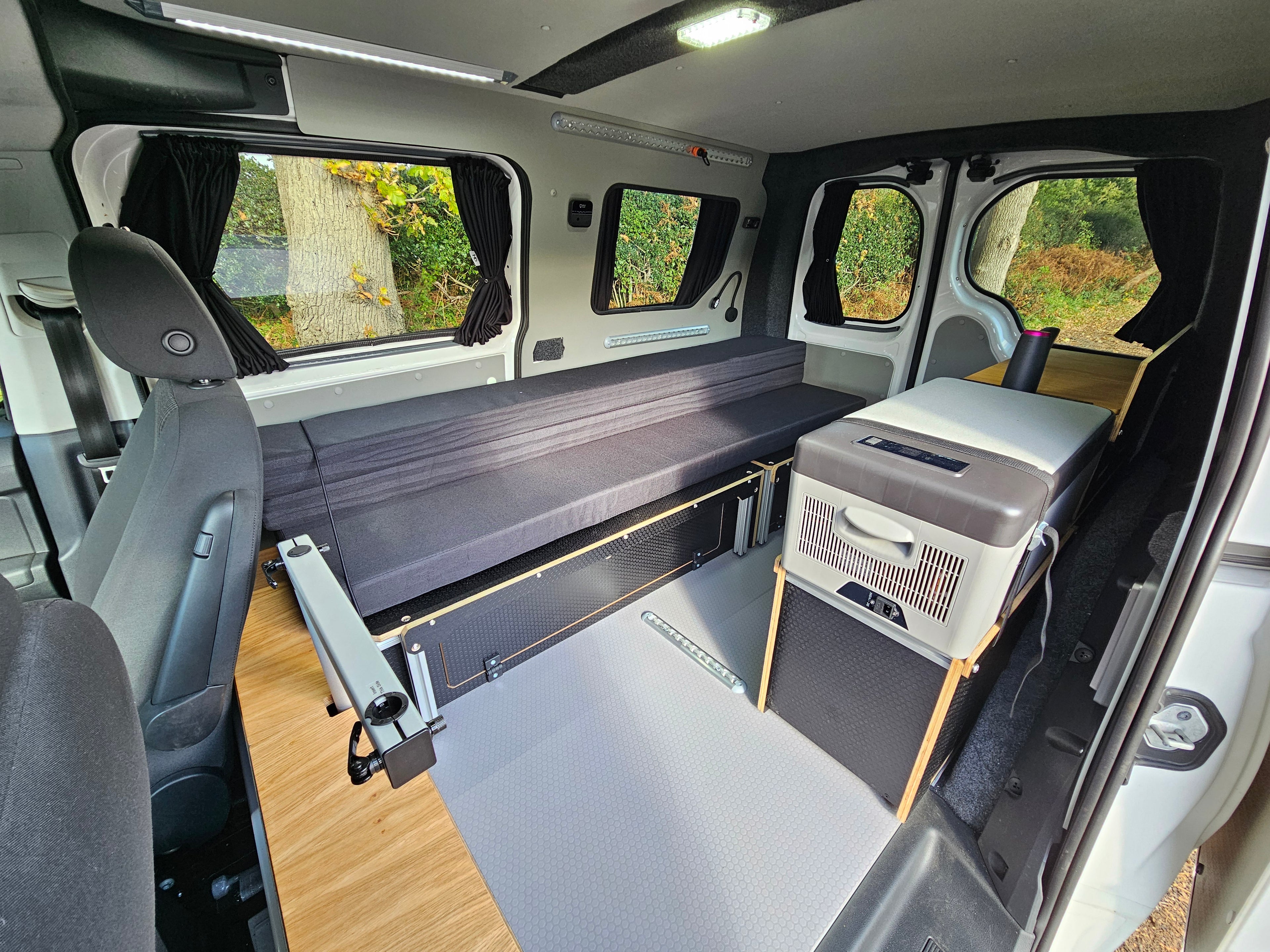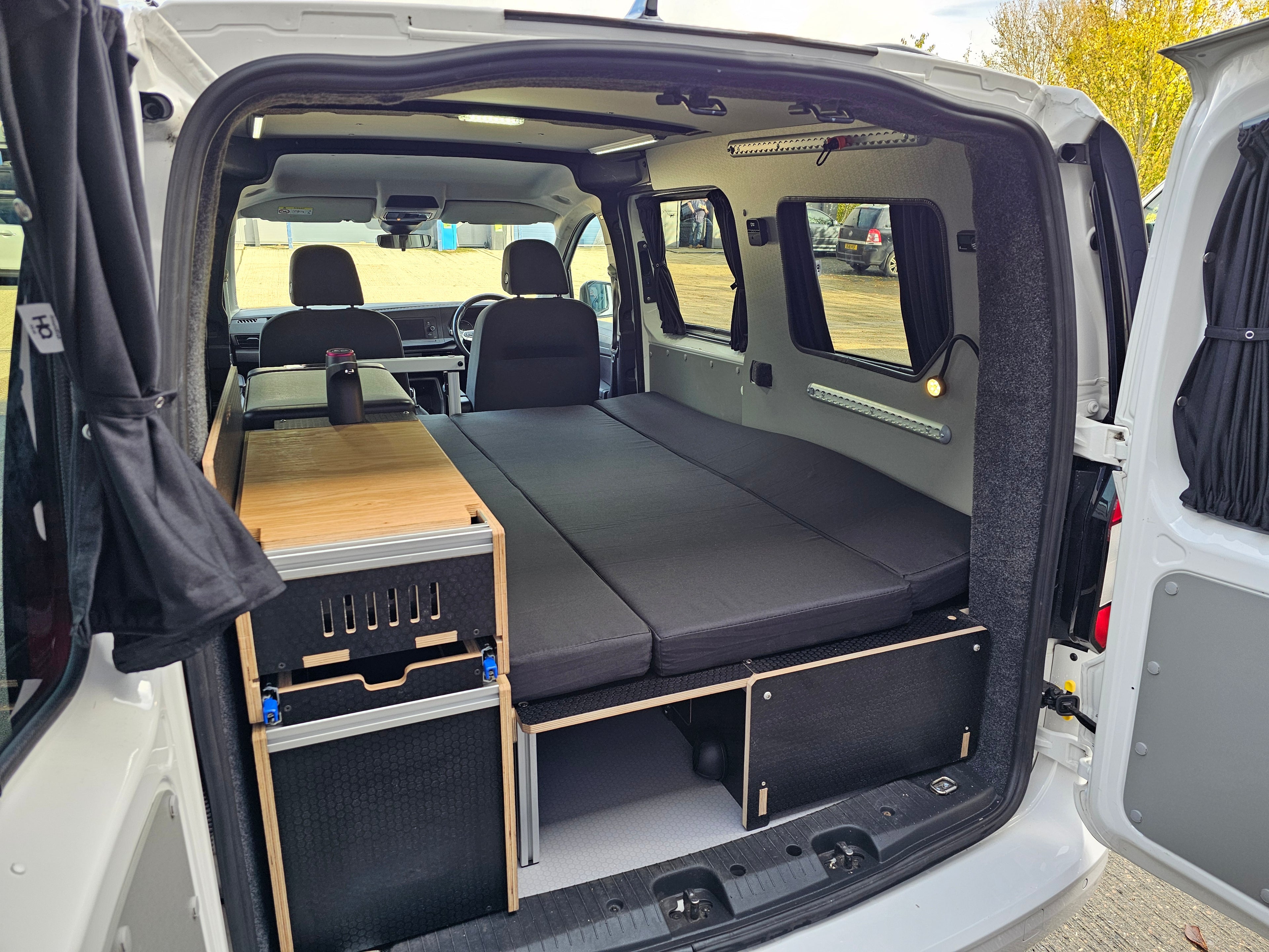 Volkswagen Caddy Maxi with the Vangear "Freerunner" conversion, for up to 2 people. The conversion features an expanding bed which also forms a seat with headroom. A sliding kitchen pod which can be used inside and outside. We can also fit a side awning, diesel heaters, panels and windows