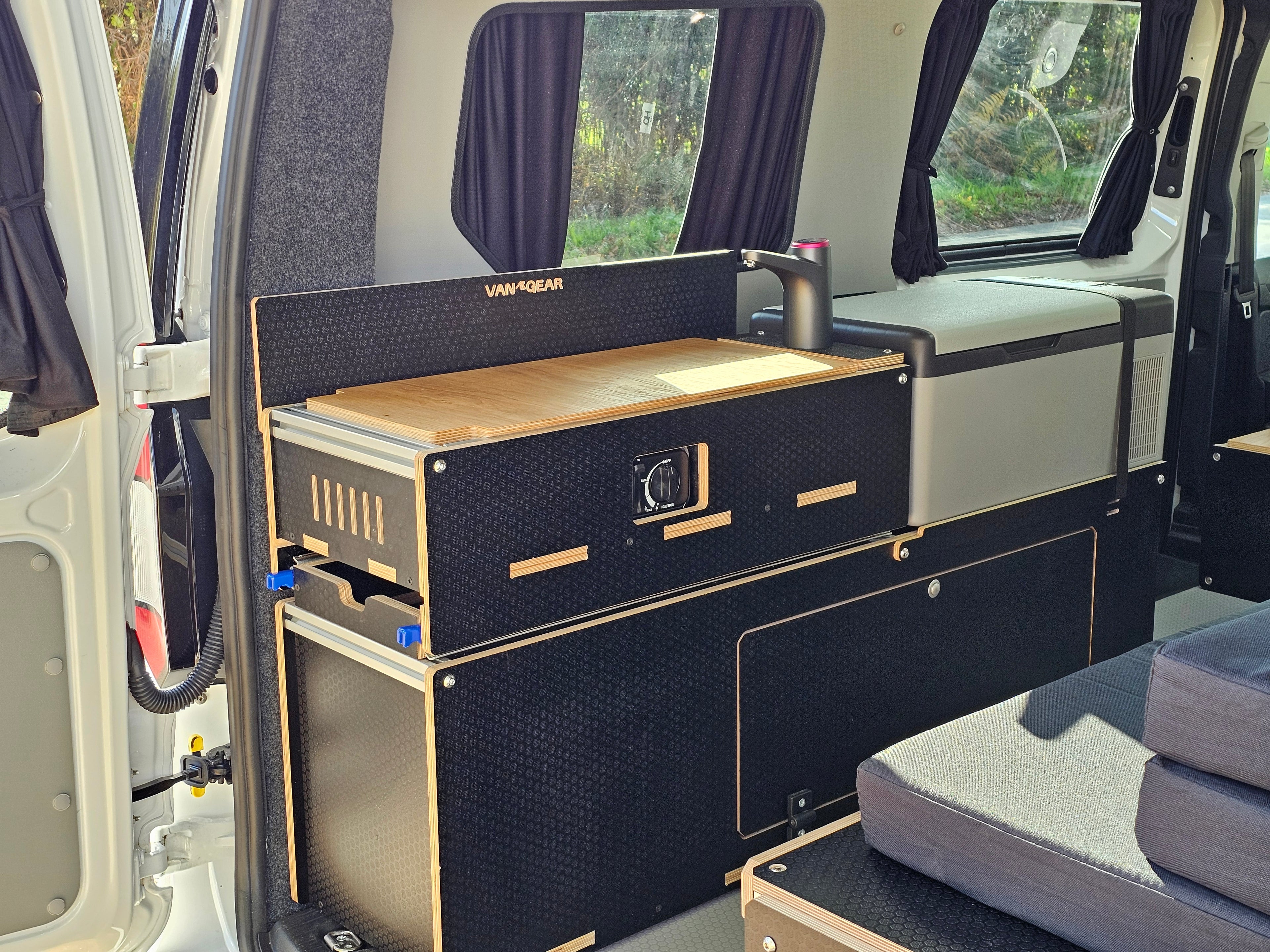 We all love food and part of the camping experience is cooking. With the “Freerunner” set up we have taken experiences from many camping trips to realise that campervan cooking is both an indoor and outdoor thing. Coming from England, where it often rains, there is a need to cook in the van. For this the Maxi-Pod has your back, there is a stove and a sink for cooking indoors and a rear sliding drawer to slide the kitchen outside for those sunny days.