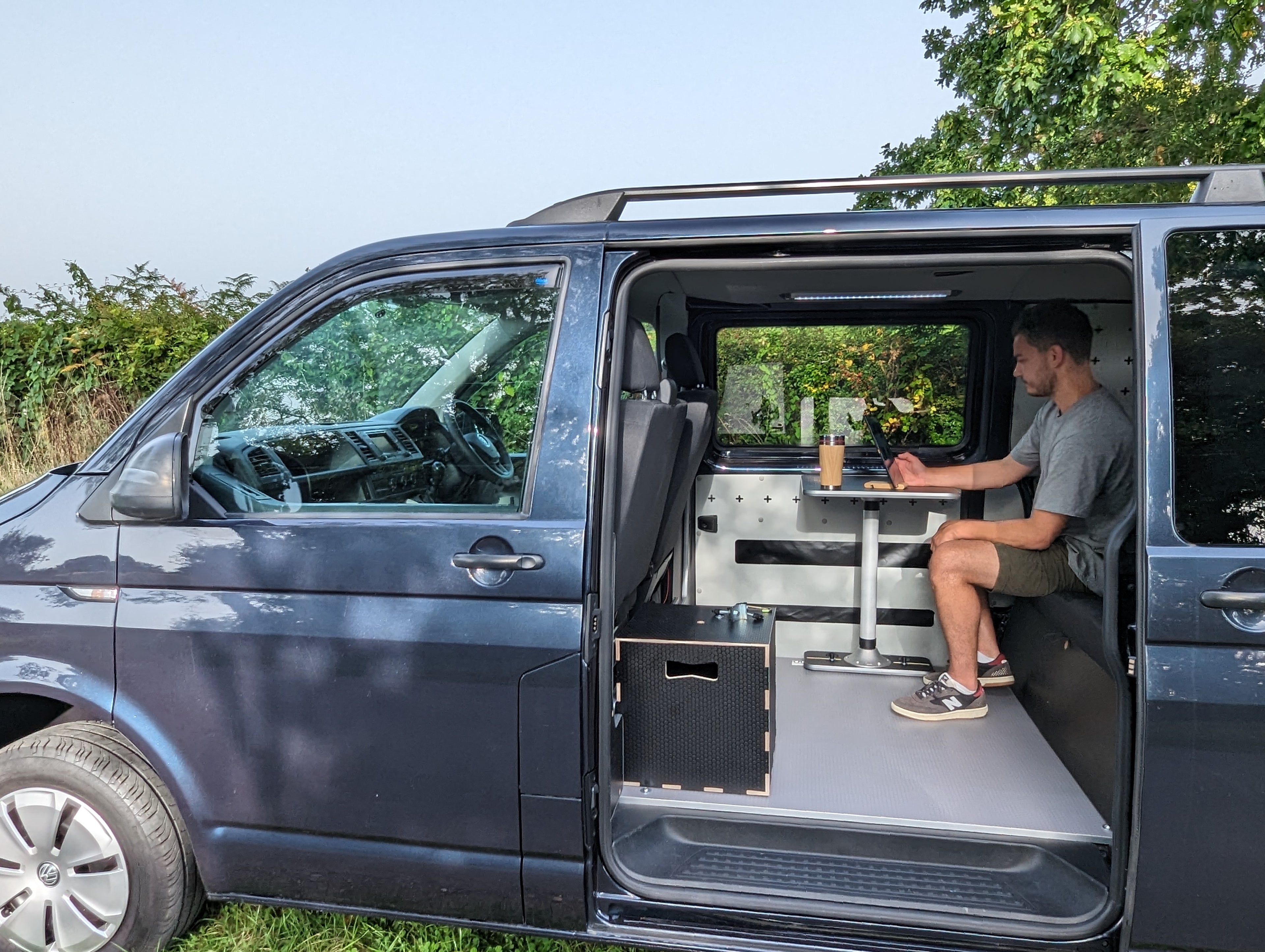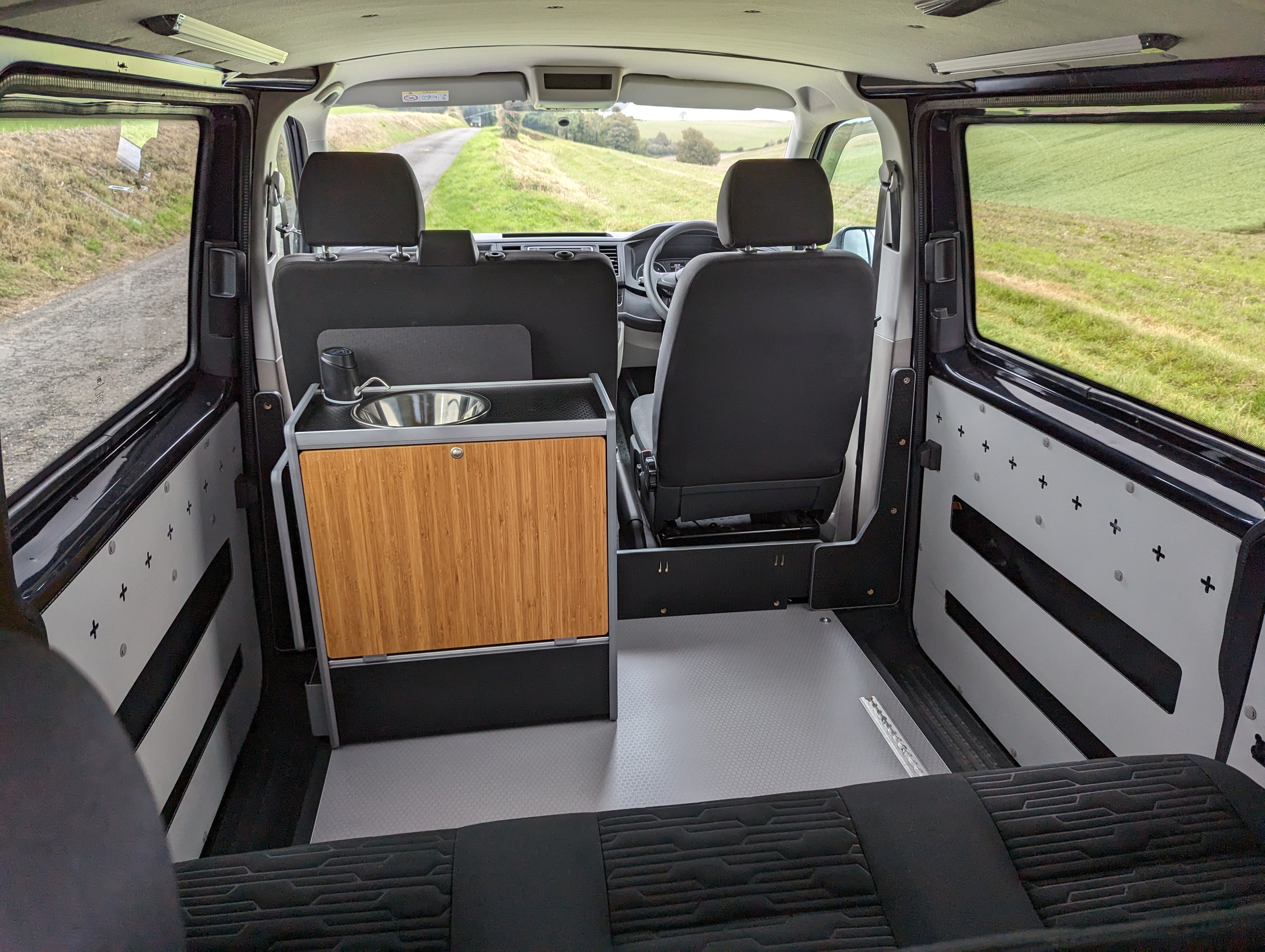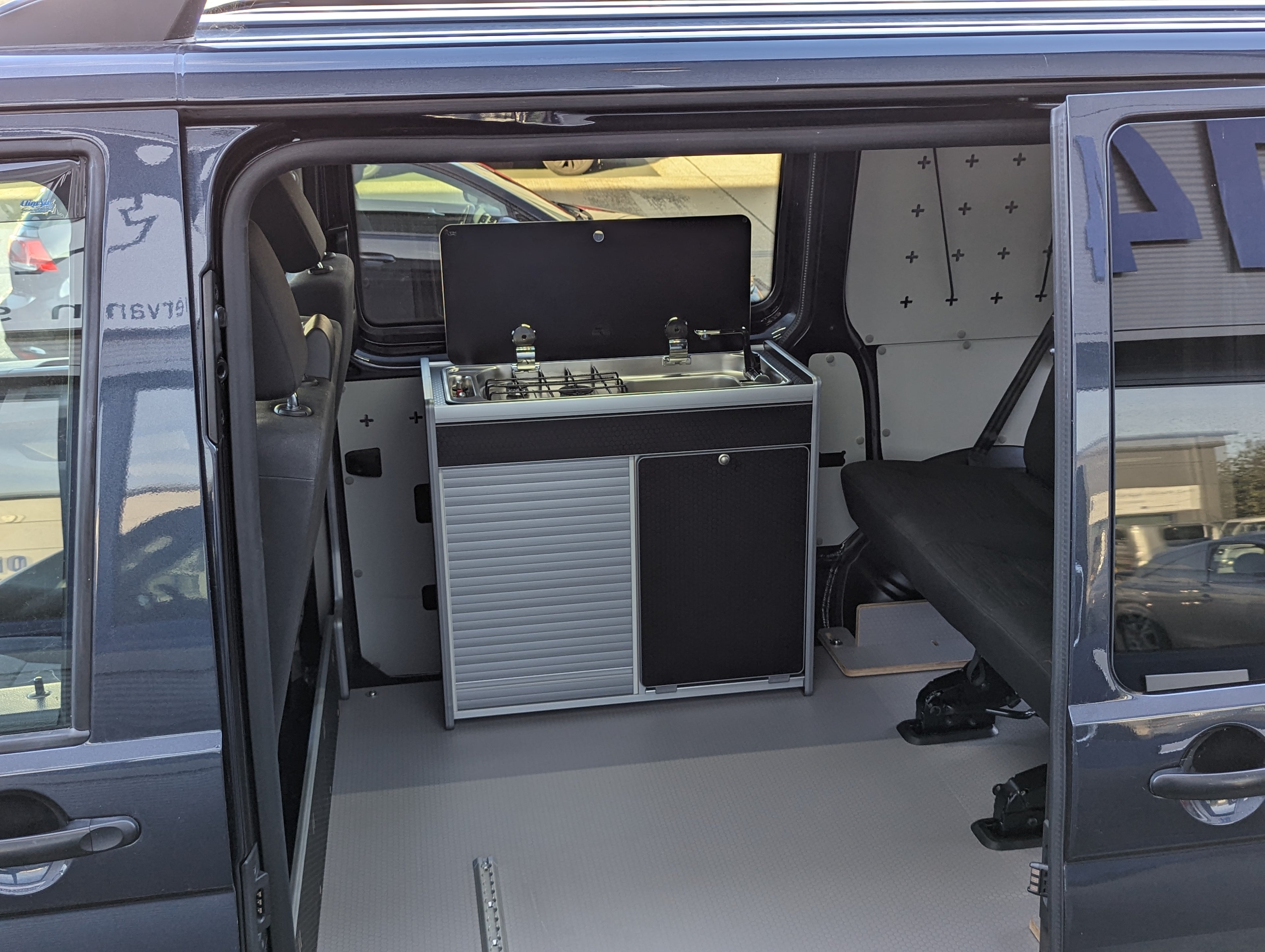 Down the side of the van modular systems. We have our Vangear Transporter system which has a Rear-Pod storage module which can be mixed and matched with our kitchen pods.