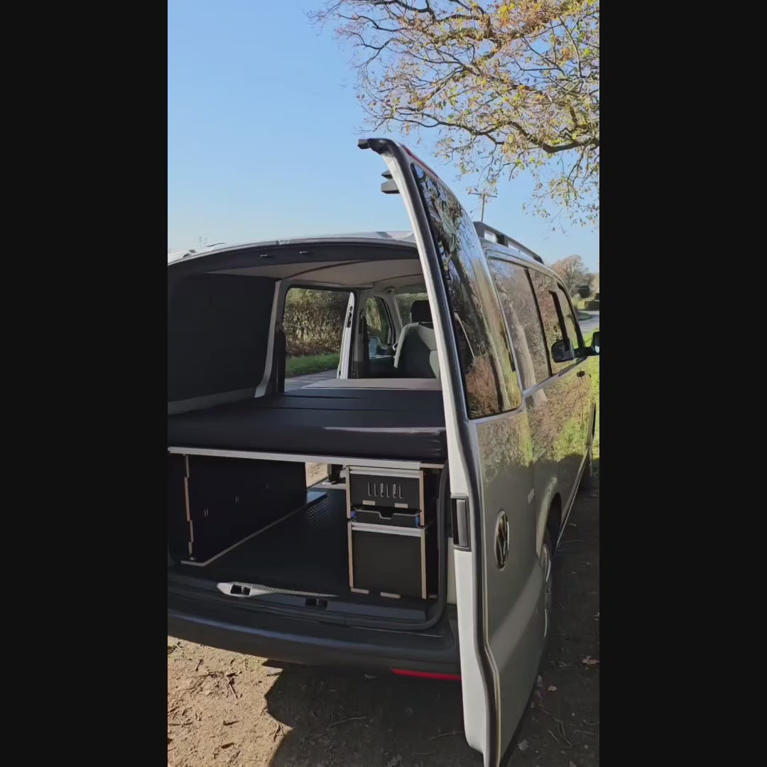 We have fitted our Vangear removable Kombi-Bed which has two useful storage compartments on the side and a fold out bed. This retains the full practicality of the boot space for sporting equipment or for work purposes. Fitting onto the side is a Vangear Tailgate-Pod, which is a sliding kitchen with a stove, sink and table.
